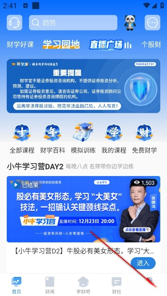 《财学堂》作为一款专业度极高的投资教学培训软件,致力于为千万投资爱好者构建一个兼具智慧与权威属性的财经教育平台。平台整合了财经新闻资讯、课程学习资源以及社区交流空间等多元功能模块,助力用户从不同维度深化对金融领域的认知。不仅如此,软件还配备了专业导师在线授课,为用户深入学习专业知识提供了便捷的渠道。