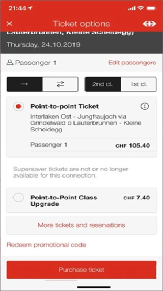 3. 按需求选择单程(一个箭头)或往返(两个箭头)及一等舱(1st)或二等舱(2nd),点击最下方purchase tickets按钮提交购票。