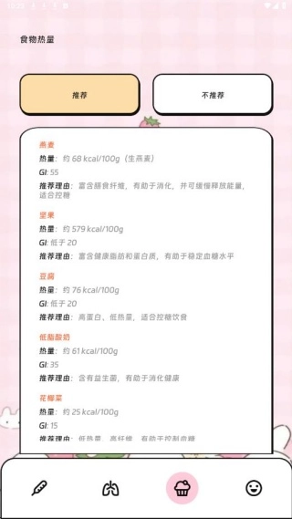 4、在食物查询页面,更直观了解各类食物对应的热量。
