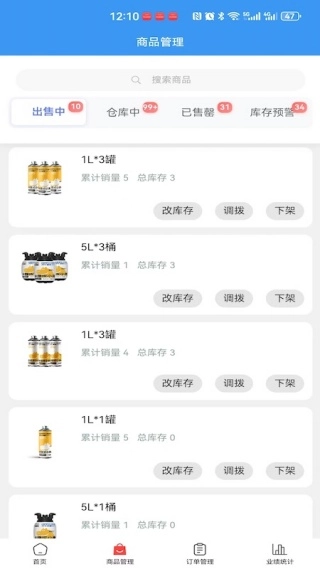 3、商品的管理界面,出售中,仓库中,已售罄等分类查看。