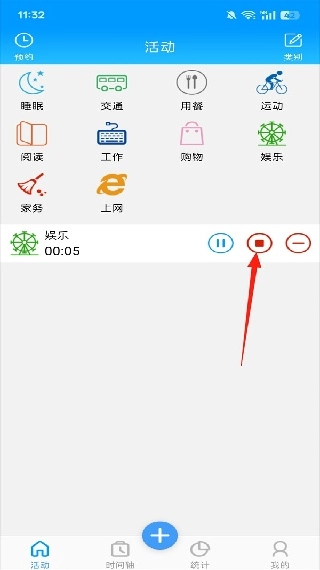 2.点击【娱乐】选项启动计时,再点击图示按钮结束计时