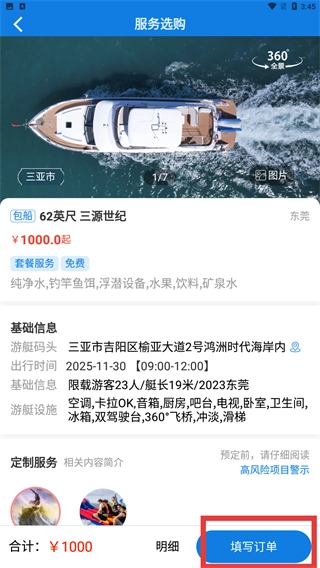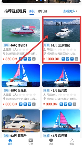 在推荐游艇列表里,挑选好目标游艇(例如“62尺三源世纪”),接着进入其详情页面。