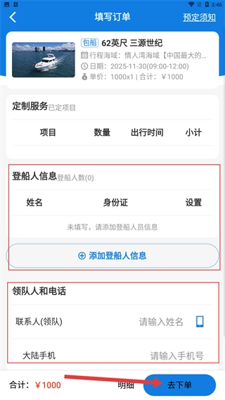 在订单填写页面,依次添加登船人员信息与领队信息后,点击【去下单】按钮即可完成预订流程。