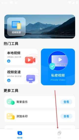 1、打开播放器页面后,点击底部的【设置】选项,即可进入设置中心的功能操作界面。