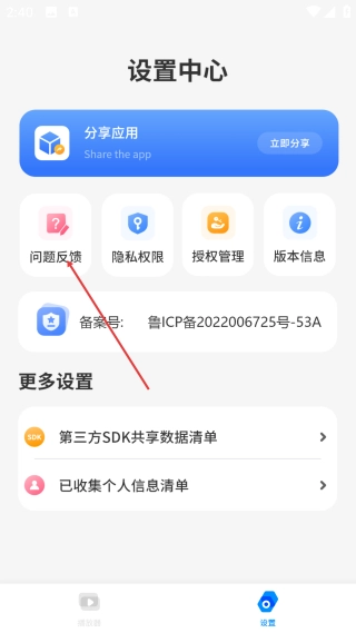 2、进入设置中心页面后,点击【问题反馈】选项,即可跳转至问题反馈的信息填写界面。