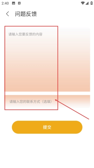 3、进入问题反馈页面后,填写【反馈内容与联系方式】,为提交反馈的相关信息做好准备。