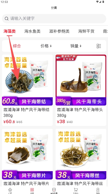 通过商品分类进入海藻类并点选目标特产查看详情。