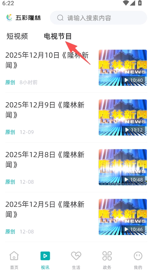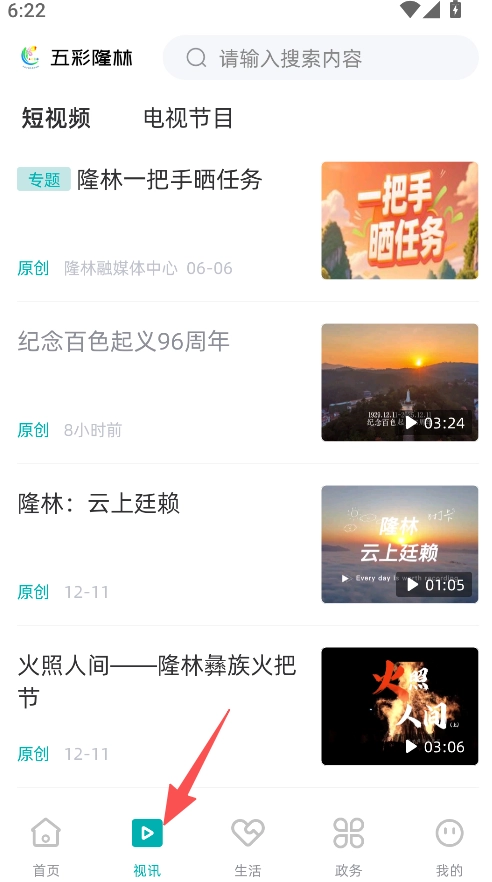打开进入视讯板块,可切换短视频或电视节目分类。