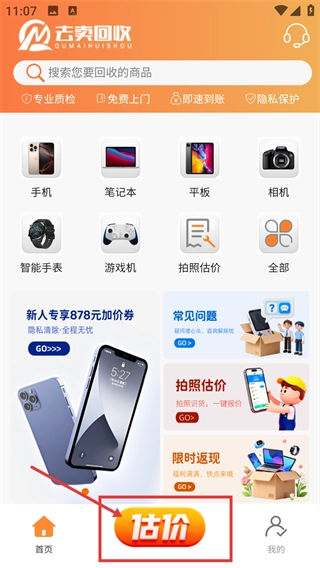 进入【去卖回收】首页后,你可以选择【手机】、【笔记本】等回收品类,接着点击底部的【估价】按钮,就能进入机型选择页面了。