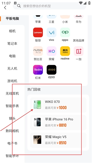 在估价页面,你可以挑选对应的品类和品牌,接着点击【热门回收】板块中的【WIKO - X70】机型,就能进入到该机型的评估页面。