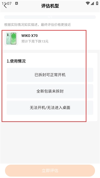 进入【WIKO-X70】的评估机型页面后,先选择【使用情况】对应的选项,如实填写这些信息,以便推进后续的评估流程。