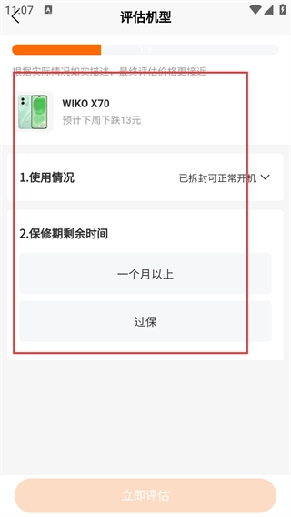 在【WIKO-X70】的评估页面,先完成使用情况的选择,接着在【保修期剩余时间】中勾选【一个月以上】-【过保】这一选项。