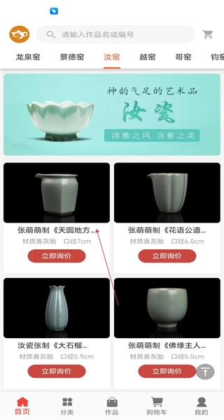 进入汝窑商品页面,浏览展示的各类瓷器商品,挑选心仪的目标商品,点击进入其详情页面。