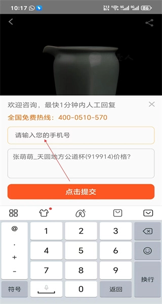 进入咨询界面后,输入手机号码,确认咨询内容,点击提交按钮发起商品咨询。