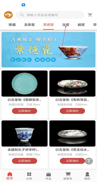 打开软件首页后,浏览顶部的分类标签,从中选择汝窑分类,即可进入对应的商品展示页面。
