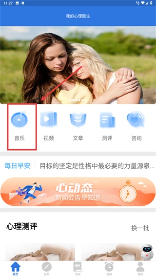 在【我的心理医生】首页找到【音乐】功能入口并点击,即可进入心理音乐分类页面,从中获取用于情绪调节的音频资源。