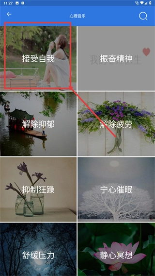 在心理音乐分类页面,找到并点击【接受自我】这一类别,进入该主题的音乐列表后,再从中筛选出与自身情绪状态相适配的音频。
