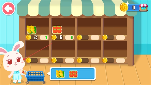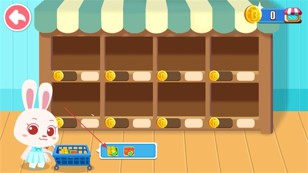 按照下方提示,从货架上挑选对应的物品,像黄色蔬果这类就放进购物车,然后启动采购流程。
