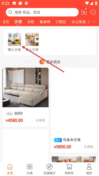 在首页点击顶部的【沙发】分类标签,就能切换到沙发类商品的展示页面,进而浏览该品类的家居产品。