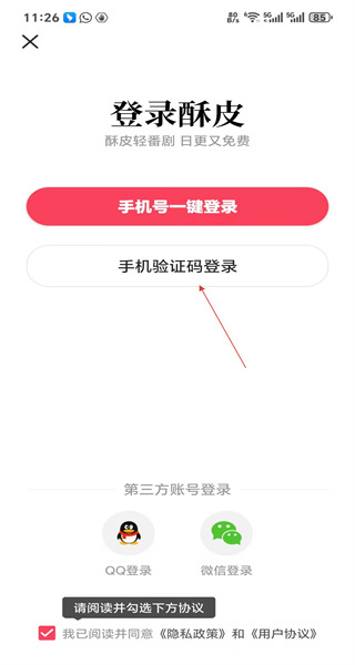 进入酥皮的登录界面后,能看到多种登录途径,选择手机验证码登录这一选项,随即进入手机号输入页面。