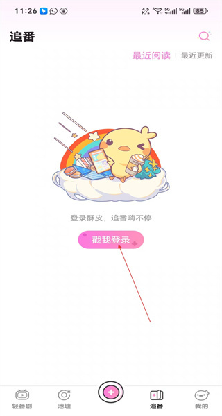打开软件后,进入追番页面,看到登录提示,点击“戳我登录”按钮,进入酥皮登录页面。
