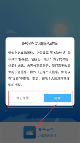 打开【青芒天气】应用后,仔细阅读《服务协议》和《隐私政策》,随后点击【同意】按钮,即可完成协议确认步骤并进入应用的主界面。