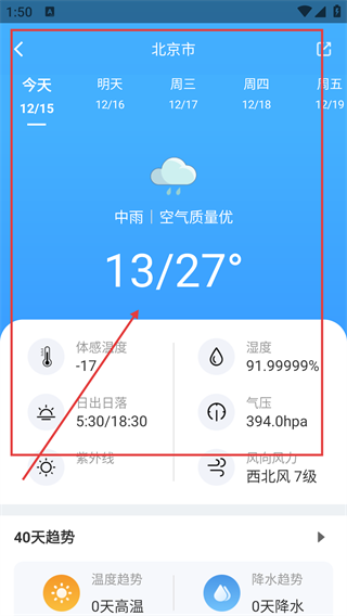 在首页滑动页面,找到【15天预报】板块,点击该板块进入15天天气的详情页面。