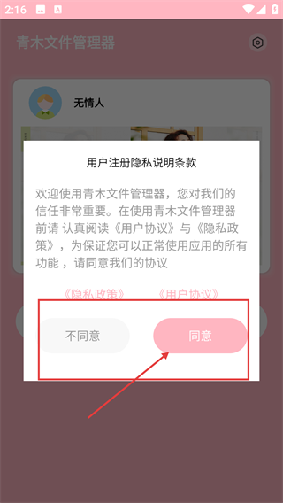 打开【青木文件管理器】后,界面会弹出【用户注册隐私说明条款】,点击【同意】按钮即可继续后续操作流程。