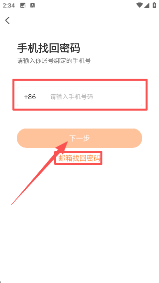 在【手机找回密码】页面,输入账号所绑定的手机号码,接着点击【下一步】按钮,以此推进密码重置的流程。