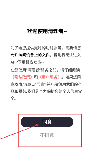 进入【清理者】应用后,先仔细阅读《隐私政策》和《用户服务协议》,随后点击【同意】按钮来授予文件访问权限,即可进入主界面。