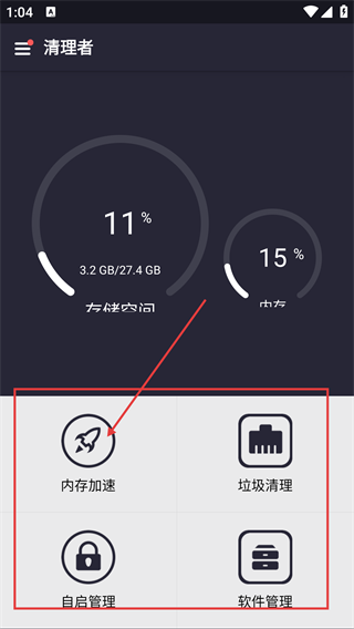 在主界面能够查看存储空间之类的数据,还可以选择【内存加速】【垃圾清理】等功能,其中内存加速主要是用来释放后台内存、提高设备运行流畅度的。