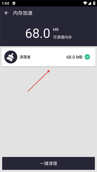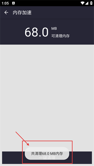 打开【内存加速】界面,查看当前能够清理的内存空间(例如68.0MB),在确认好需要清理的项目之后,就可以准备进行清理操作了。