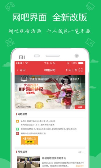 网费充值:支持微信、支付宝、QQ钱包等多种支付方式,100%还原网吧充值赠送金额,每月还有额外充值奖励,让您享受更多优惠。