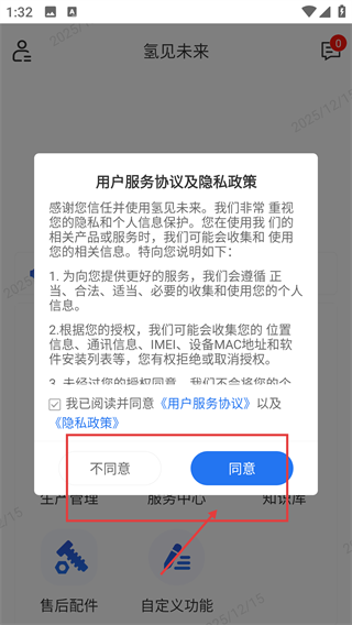 进入【氢见未来】后,勾选“我已阅读并同意”,点击【同意】按钮,完成协议确认并进入应用主界面。