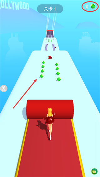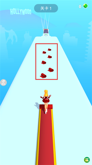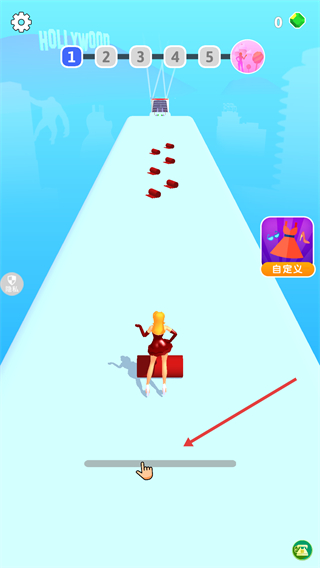 在【红毯女王】关卡界面,通过滑动底部的操作条来操控角色移动,收集路径上的红毯片段以拓展其长度。