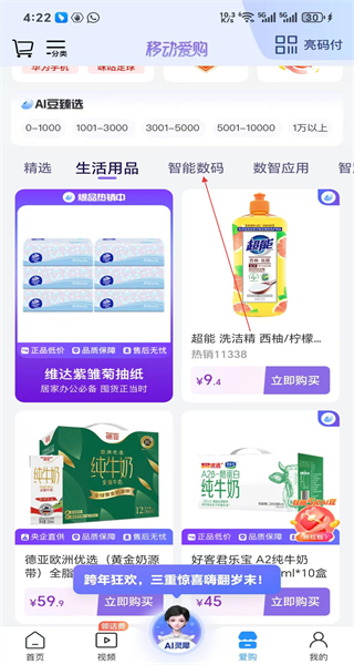 2、进入移动爱购页面,选择智能数码分类,切换到智能数码商品的展示页面。
