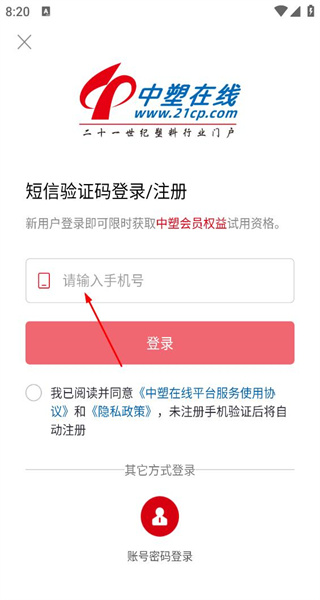 4、进入短信验证码登录注册页面后,找到“请输入手机号”的输入框,之后可以在此输入手机号,进而完成登录流程。