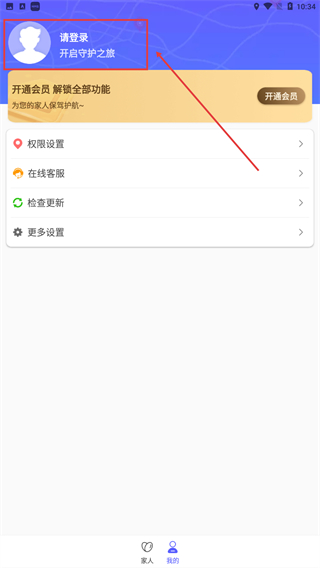 3、在【我的】界面,点击顶部【请登录-开启守护之旅】区域,可进入登录流程,同时可操作权限设置、在线客服等功能。
