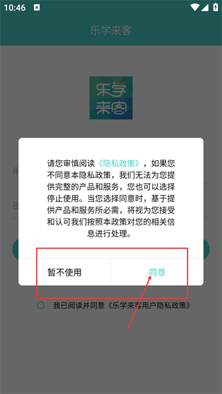 1、在弹窗中阅读【隐私政策】,若同意其信息处理规则,点击【同意】按钮,即可继续获取【乐学来客】的产品与服务。