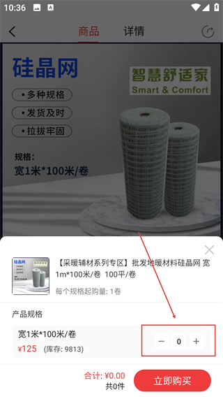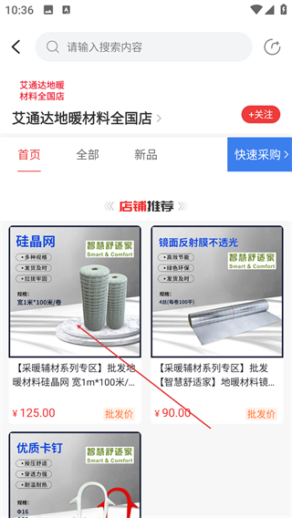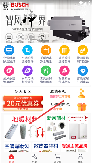 1、在首页选择对应品类(如【地暖材料】),进入相关商品专区,可查看该品类下的各类建材产品。