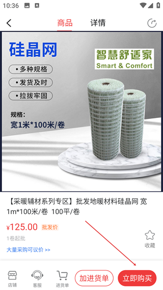 3、在商品详情页,可查看商品参数、价格等信息,点击【加进货单】或【立即购买】进入下单流程。