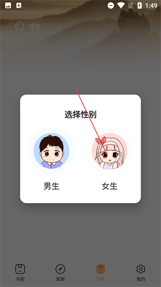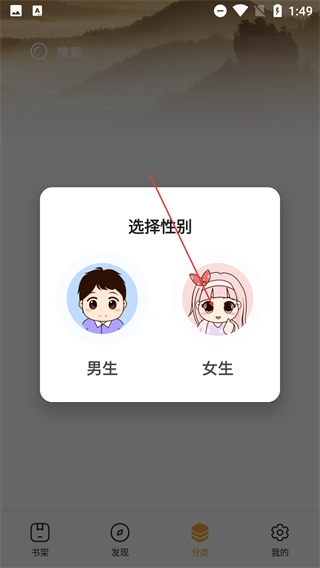 1、在【选择性别】弹窗中,点击【男生】或【女生】选项完成性别选择,即可进入应用主界面。