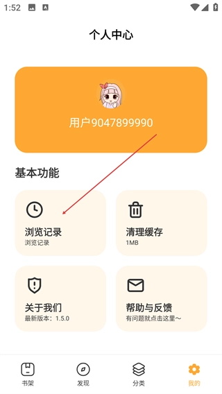 3、进入【个人中心】,可使用【浏览记录】查看阅读轨迹,也能通过【清理缓存】释放1MB存储空间。
