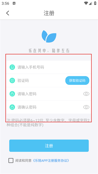 3、进入【注册】页面后,请按顺序填写【手机号、验证码、密码】这三项信息。其中,密码需符合6到12位长度,且包含两种及以上字符组合的要求。完成信息填写并勾选相关协议后,即可提交注册申请。