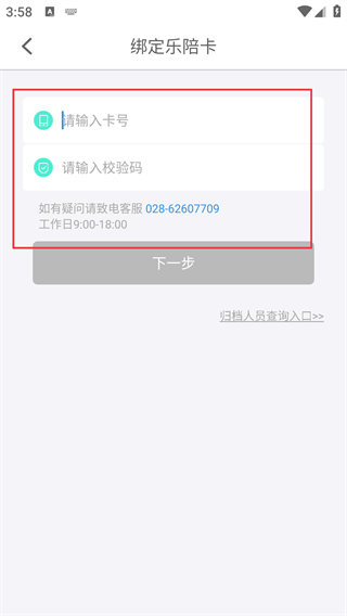 4、进入【绑定乐陪卡】页面,填写【卡号-校验码】信息,即可完成卡片绑定操作。