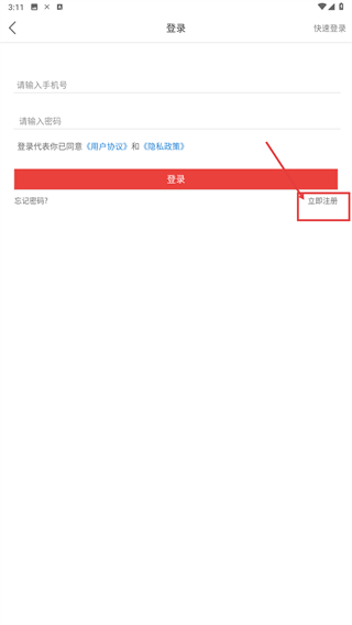 3、在登录页填写【请输入手机号】与【请输入密码】,确认协议后点击【登录】;无账号可点击【立即注册】进入注册流程。
