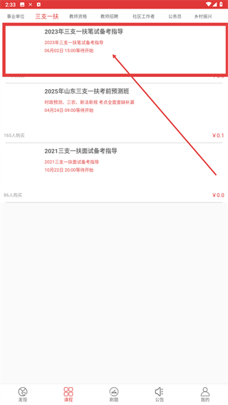3、在三支一扶课程列表,点击目标课程(如《2023年三支一扶笔试备考指导》),进入课程详情页面。