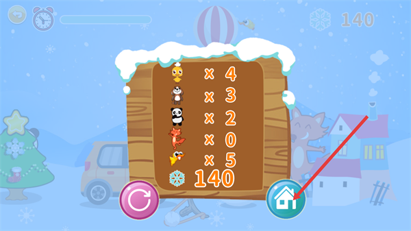 4、在冬季场景的计算环节,可查看本轮得分,点击【房子图标】可返回场景主界面或结算当前进度。