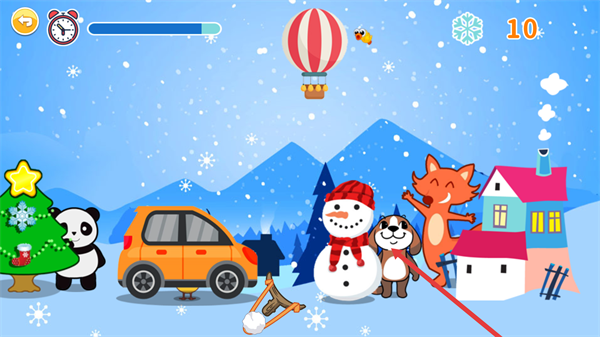 3、进入冬季场景后,可观察场景内的动物(如小狗、狐狸),在合适的时机点击动物同时抛出雪球,每击打一次得分10分。
