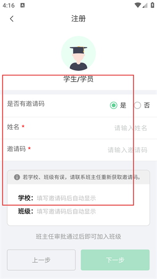 4、在学生/学员注册页,选择是否有邀请码,填写【姓名-邀请码】等必填信息,提交后等待班主任审批即可加入班级。